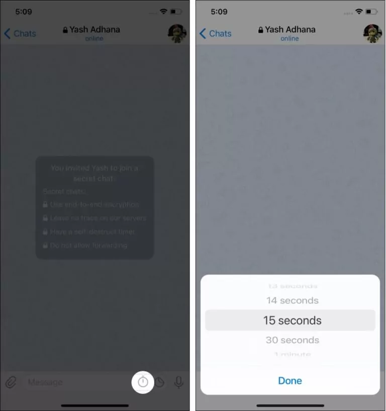 步骤 4:在聊天栏点「时钟」,设消息自毁时间(1秒到1周)