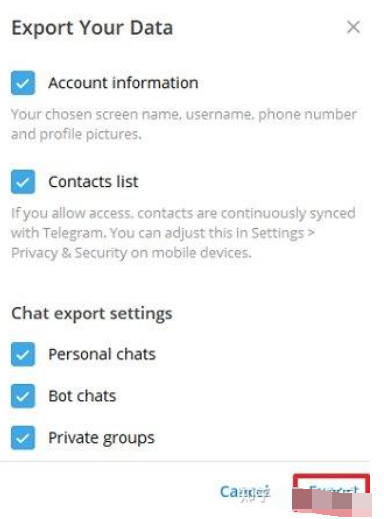 第 3 步: 找到“数据和存储”那一栏,点【导出电报数据】,勾选你想导出的聊天类型——个人、群组、私密对话,全选都行。