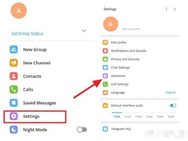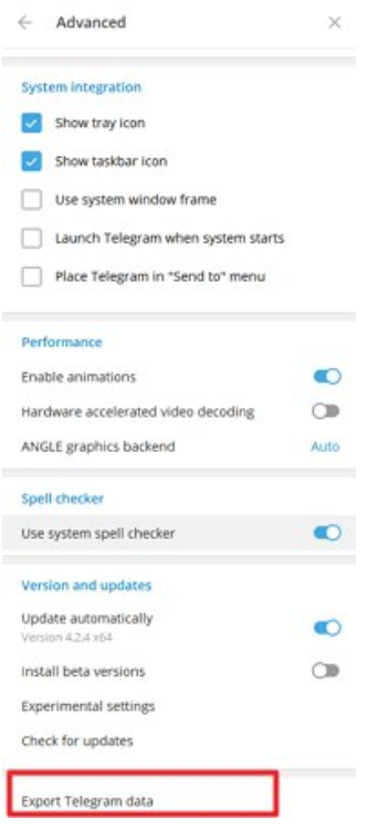 打开桌面版 Telegeram,进入 设置 > 高级 > 导出电报数据。