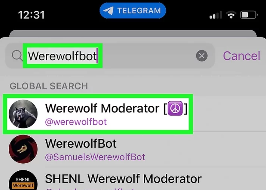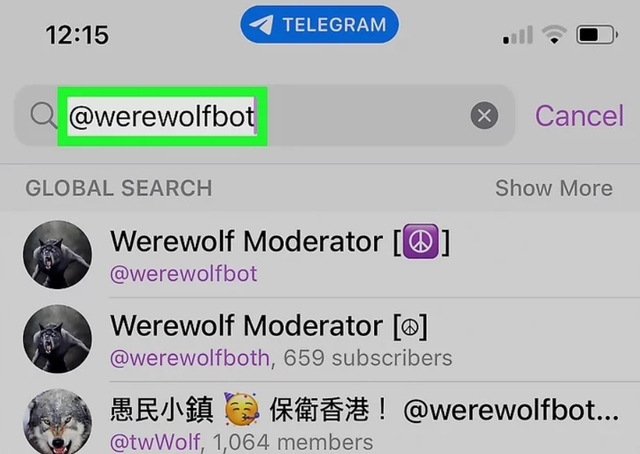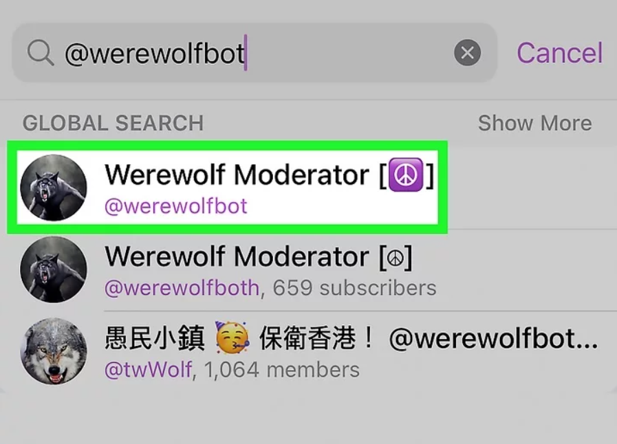 3、在搜索栏里输入 @werewolfbot,下面就会显示搜索结果。