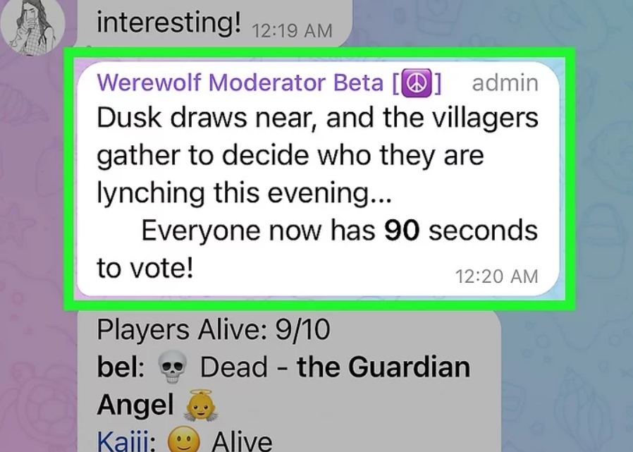 6、点 关闭 返回聊天,就能在群里玩狼人杀了。