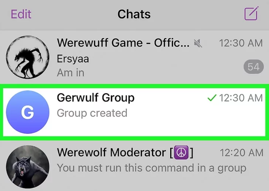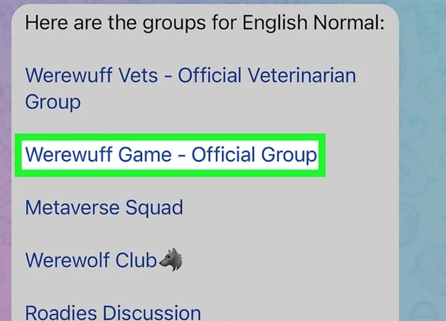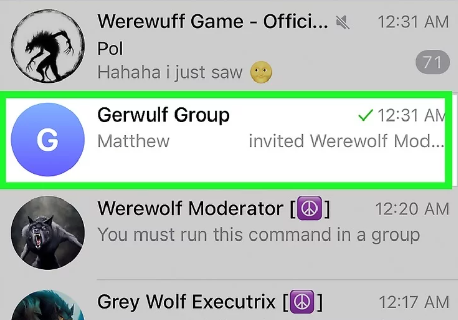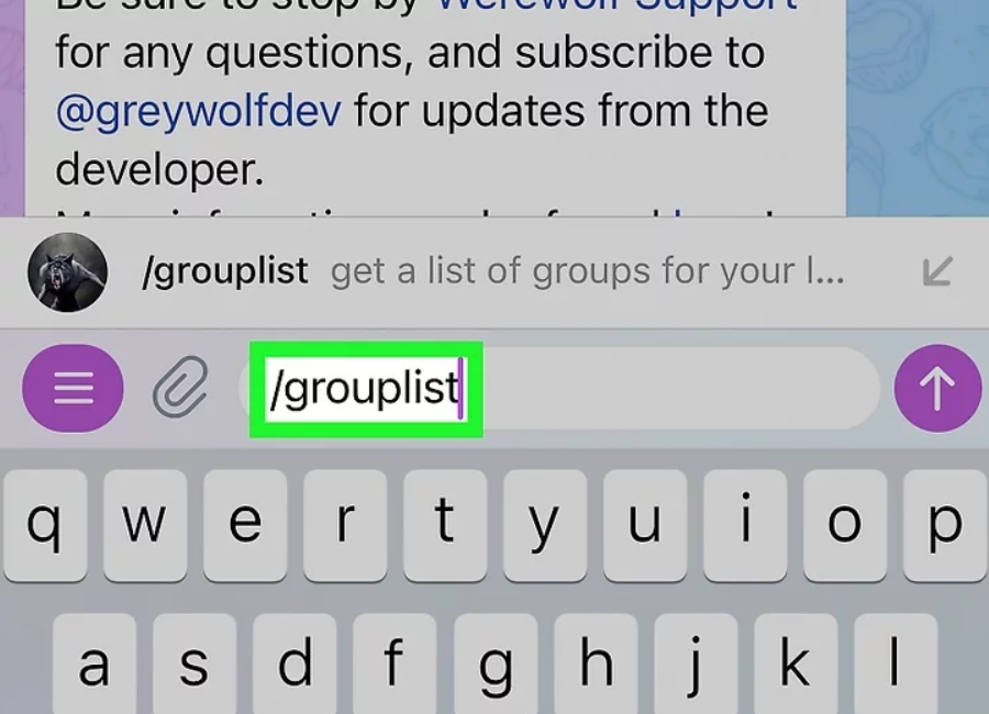 6、在消息栏输入 /grouplist 然后发送,它会帮你找可以玩的群。或者你也可以直接搜官方群 “Werewolf - The Game”,人最多。