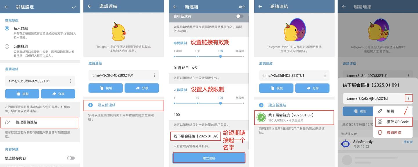 操作步骤:在群组链接页面点击【管理邀请链接】—【建立新链接】,设置有效期和人数限制,给链接起名字,点击【建立链接】。然后复制短期链接或生成二维码,打印出来,让客户现场扫码就能加入群组。