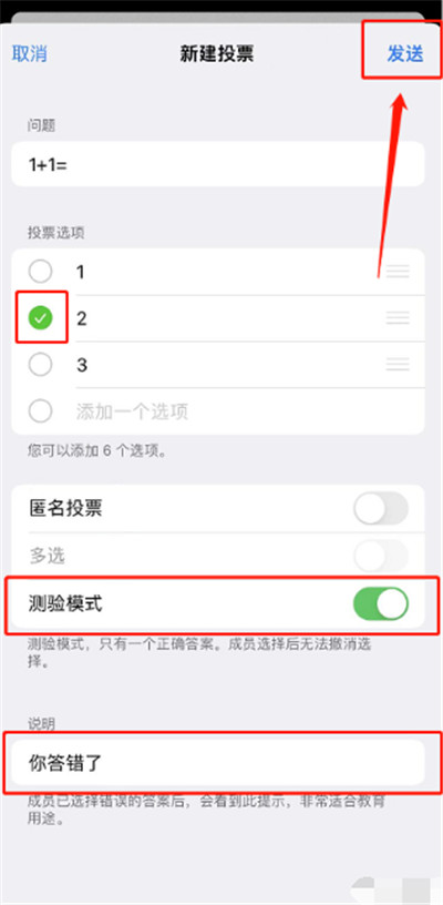 6、如果开启测试模式,还能设置正确答案,甚至给选错的人弹出说明。