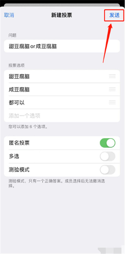 3、这里举个普通匿名投票的例子,输入完毕后点击「发送」。