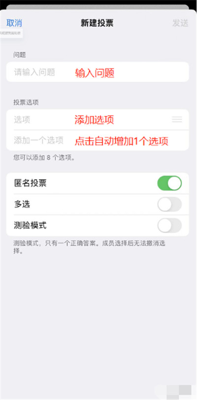 2、选择「投票」,这时候你会看到可以输入问题、添加选项的地方。顺便还能选匿名投票、多选,甚至有测试模式。