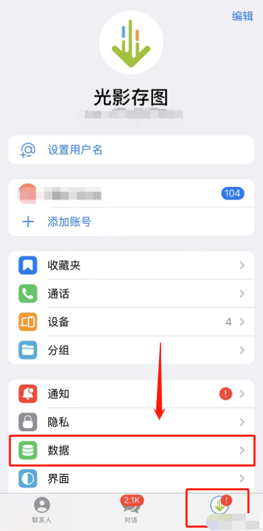 在电报设置页面找到「数据」