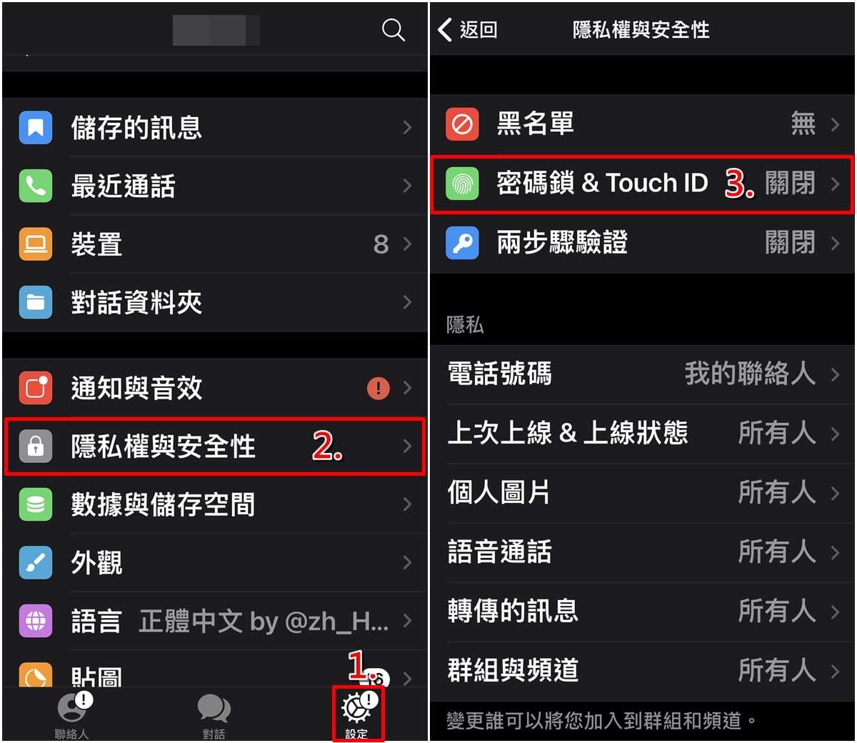 进入 Telegeram 「设置」页面,依次选择「隐私权与安全性」>「密码锁&Touch ID/Face ID」。