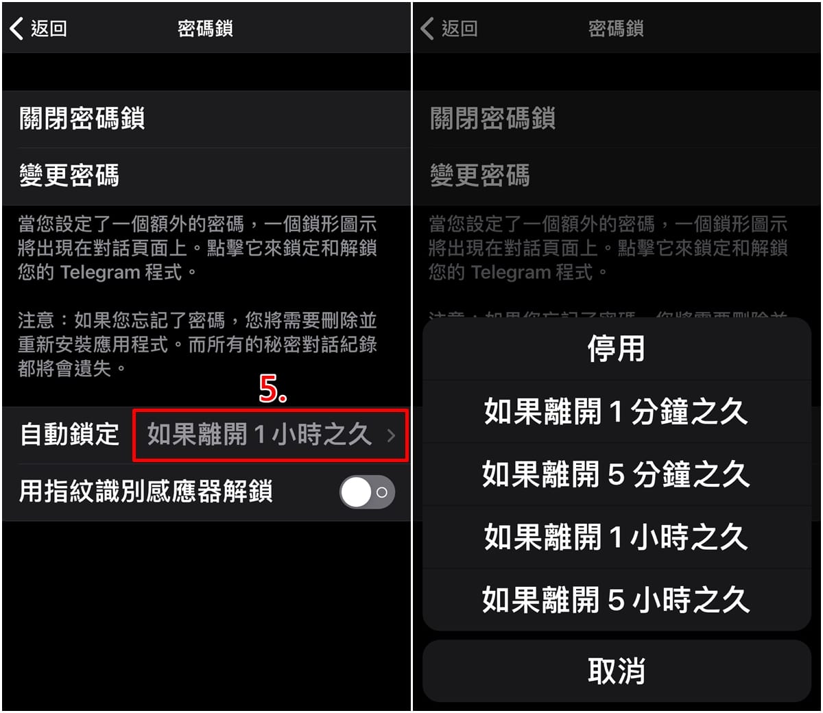 设置好密码后,还可以开启「自动锁定」,选择 Telegeram 闲置多久自动上锁,别人就看不到你的消息了。