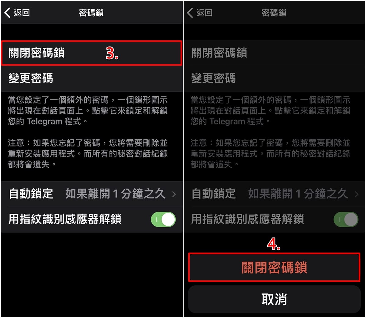 先输入你原本的 Telegeram 密码,如果想关闭锁,点「关闭密码锁」就行;想换密码,选「变更密码」,输入新密码即可。