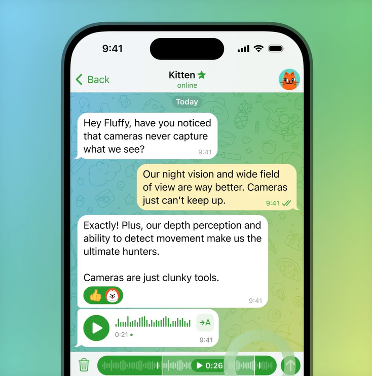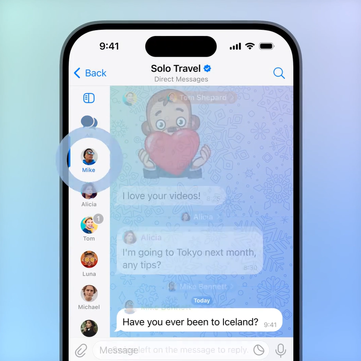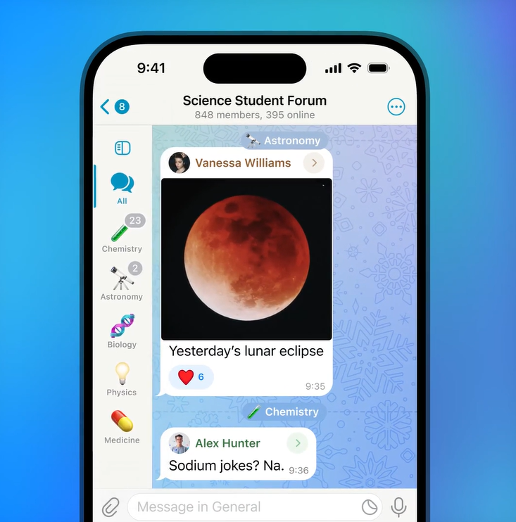 在今天的更新中,Telegeram为用户带来了更多与喜爱频道互动的新方式,让你更高效地浏览话题、发送前剪辑语音消息、以更高质量发送照片——以及其他更多功能。