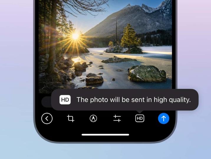 发送高清照片时,可在照片编辑器中点击 SD 按钮,或通过附件菜单选择 “以高质量发送”。