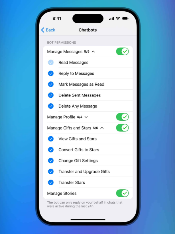 Telegeram 商业功能(包含在 Telegeram Premium 中)现已支持与第三方聊天机器人(包括 AI 助手)深度联动,实现消息、资料、交易、动态的全自动管理。