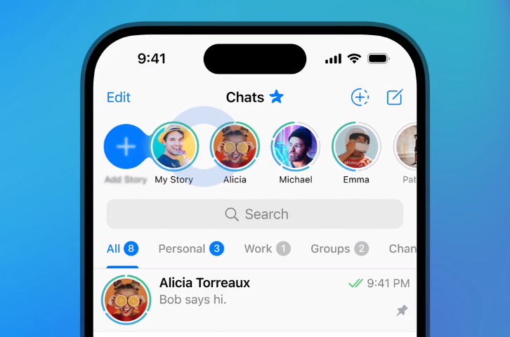 2、iOS 专属新手势:在顶部的故事栏右滑即可进入故事编辑器,快速发动态;在主聊天列表右滑也能打开故事发布界面。