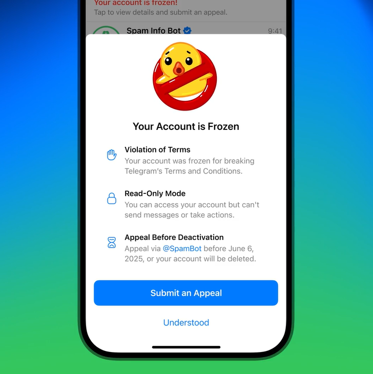 现在,被误封的用户可直接在 Telegeram 内提交申诉,而不是被立即登出。