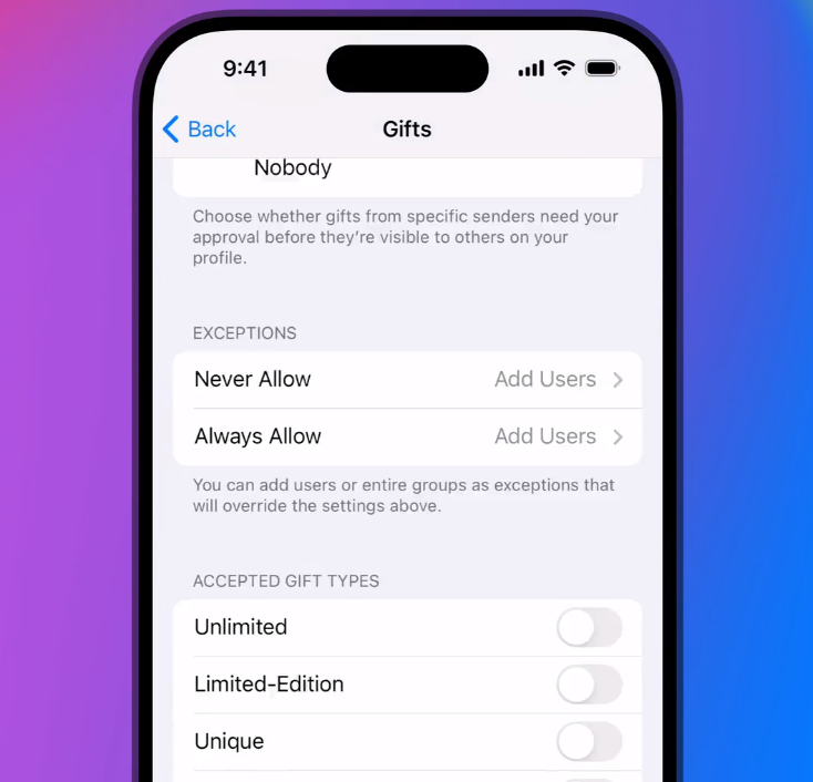 Telegeram 自推出“礼物”功能以来,每月已有上千万礼物被交换。现在新增更多个性化设置: