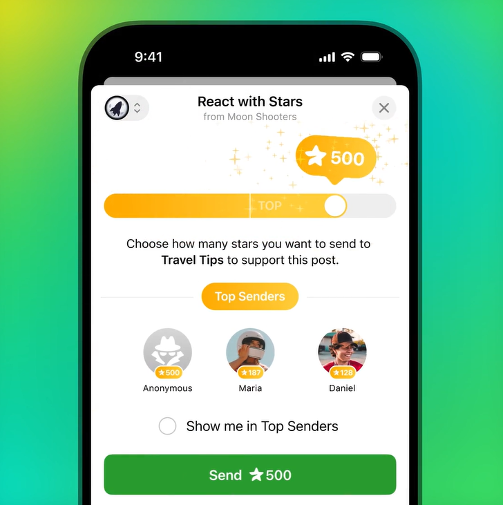 以前用户用星星表情支持创作者,现在可以直接用自己管理的频道身份来发送星星了。这不仅更方便,也让创作者能在排行榜中展示自己的频道。星星反应依旧支持匿名模式,想低调点也完全没问题。