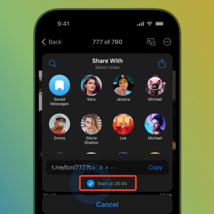 自2019年起,视频信息里的字幕和回复就支持时间戳,比如“1:38”这种能直接跳转片段的格式。而现在你在分享视频时,也能带上当前的播放时间。别人点开链接后,视频会自动跳到那个时刻。不管是在聊天里还是外部平台上都能这样用。要分享带时间的链接,只需点击播放器里的分享箭头,系统会自动让你选择是否包含当前时间。