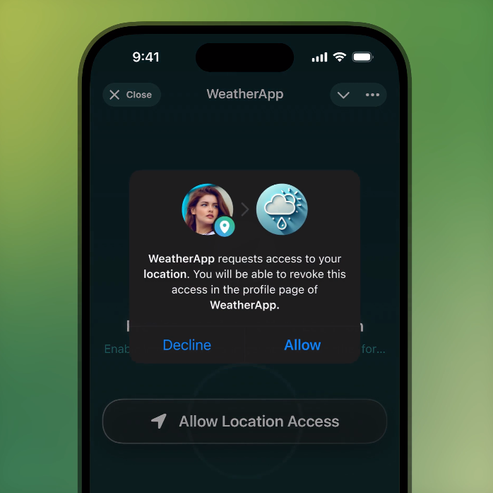 你可以选择把位置分享给 mini apps,这样开发者就能做出基于位置的游戏、活动地图或有趣的互动场景。
