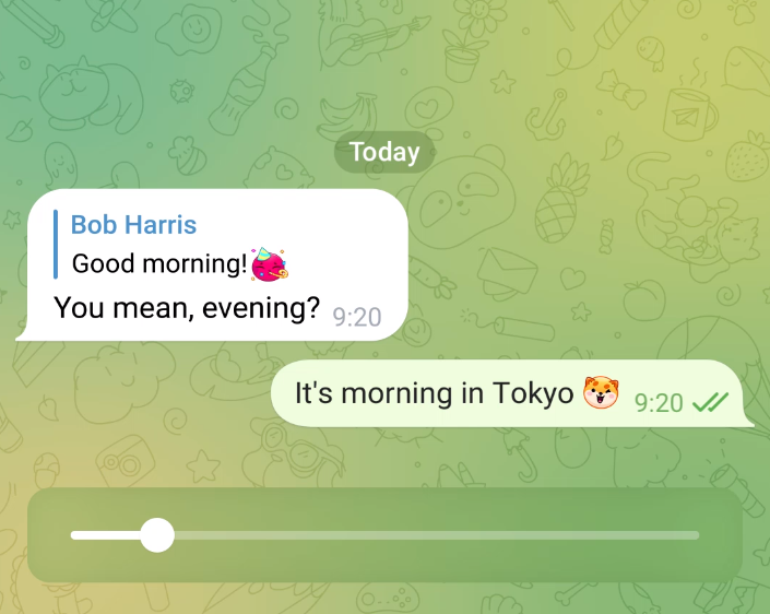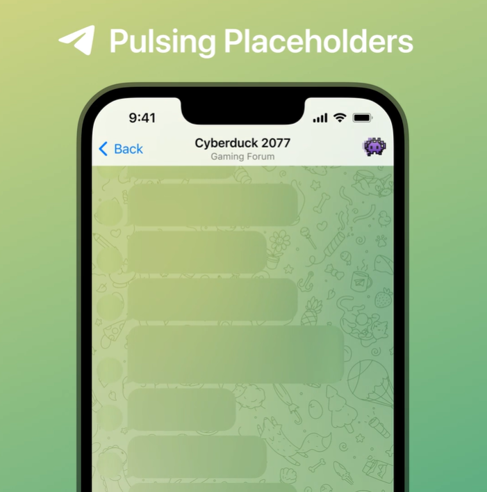 左滑回复增加了新动画。点用户资料页里的电话号码会弹出更多通话选项。群或频道加载消息时,也会看到新的脉冲占位动画,更加直观。