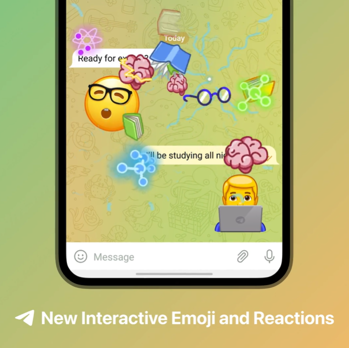 为了学习、睡觉或者疑神疑鬼,这次增加了 4 个互动表情 😴👨💻🤓👀,可在一对一聊天里全屏播放,也能作为反应使用。万圣节期间,大家还能用 👻🎃😭 三个反应在任何聊天里玩。