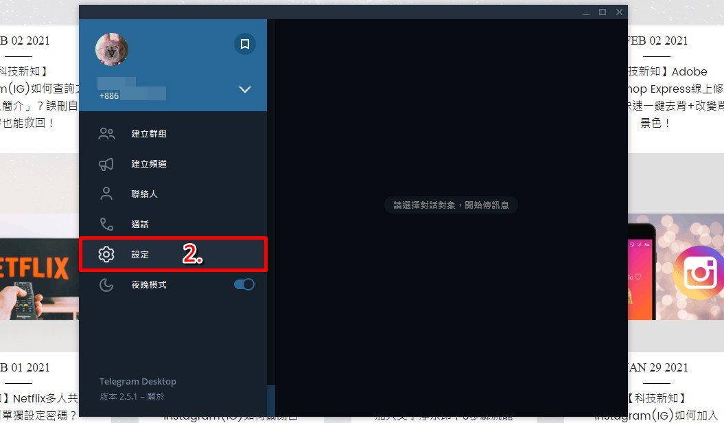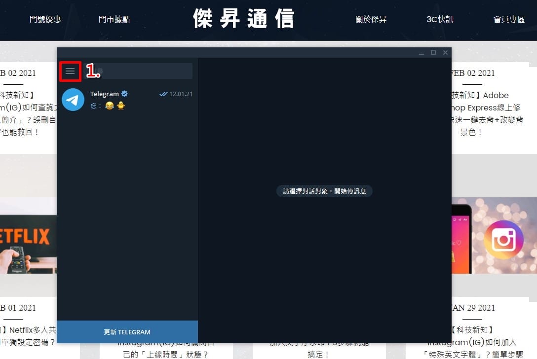 因为手机端和电脑版操作差不多,这里就用电脑版本示范给大家看。先点开 Telegeram 左上角的「三」按钮。