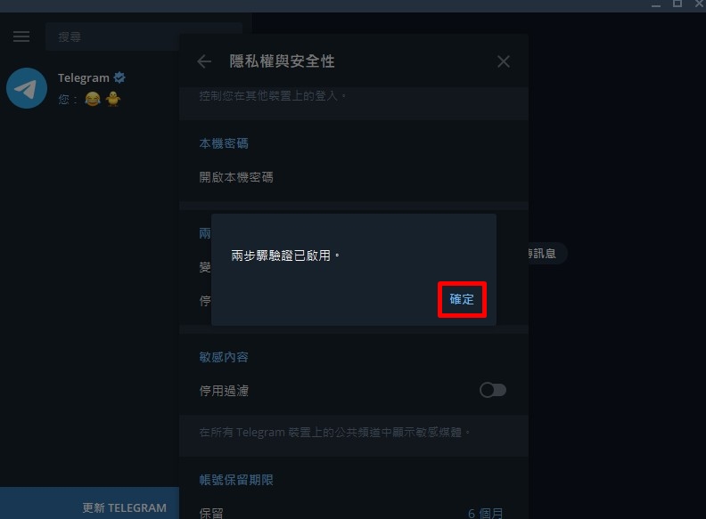 系统会给你的备用邮箱发一封验证邮件,去邮箱收验证码,然后在 Telegeram 里输入。看到「两步验证已启用」跳出来的时候,说明搞定了!从此以后,用新设备登录 Telegeram,不只得收到短信验证码,还要额外输入刚设定的密码才能成功登录。这样一来,安全感是不是瞬间就提升了不少?