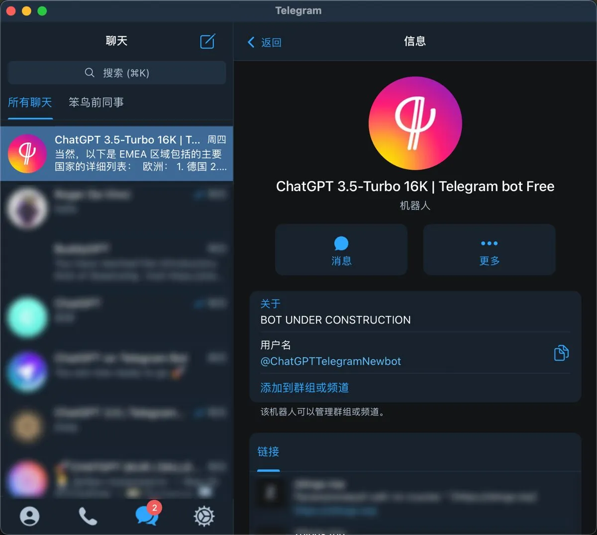 在Telegeram上玩ChatGPT其实挺有意思的。Telegeram本身就是开放平台,第三方机器人林林总总。聪明的开发者利用Bot API,把ChatGPT搬进了Telegeram,弄出各种机器人。最近小编发现了一个挺好用的——@ChatGPTTelegeramNewbot(ChatGPT 3.5-Turbo 16K | Telegeram bot Free)。想用AI的朋友可以直接上手,真的是Telegeram里的ChatGPT小神器。