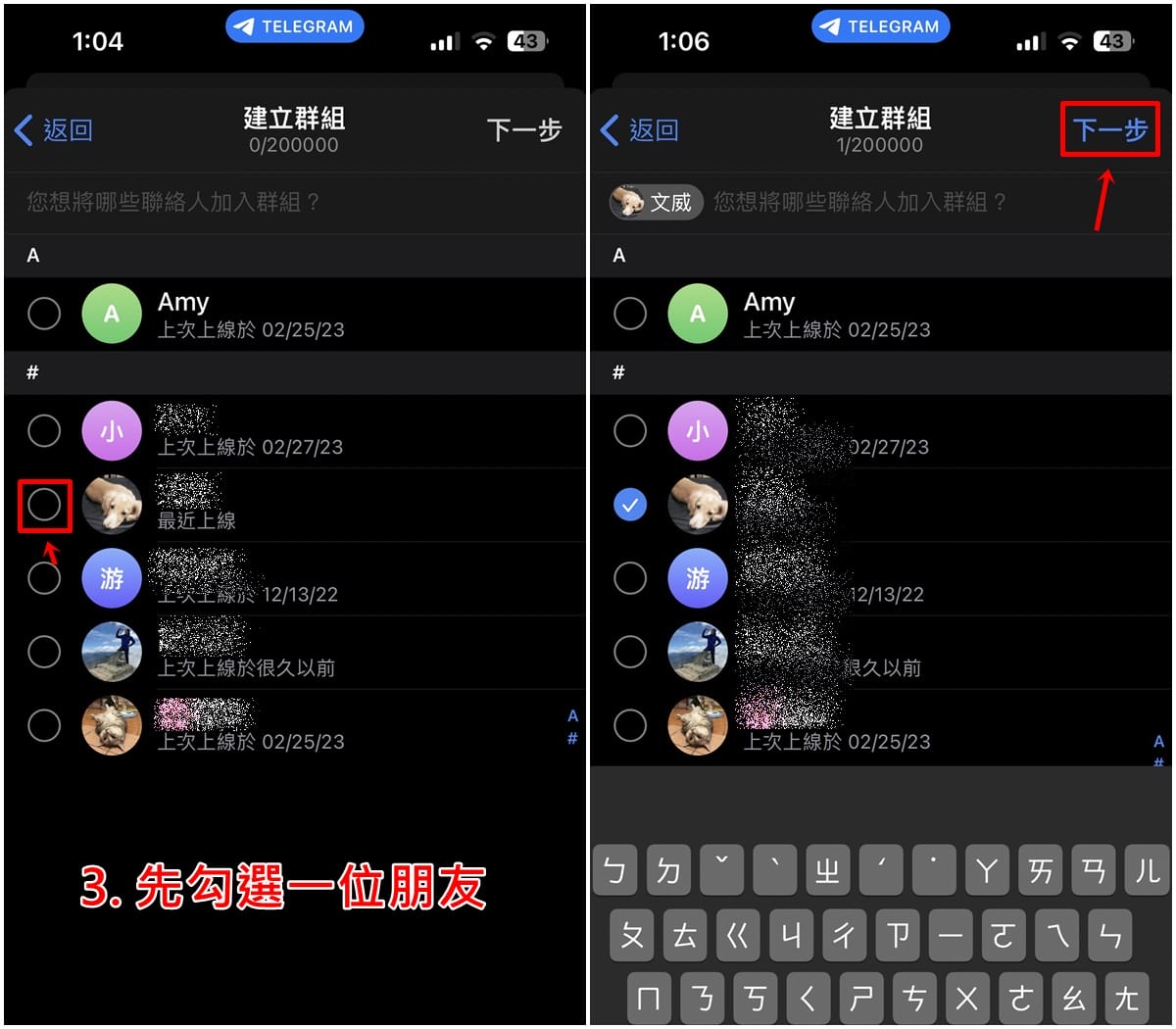 系统会要求你加一位朋友进群,随便选一个,点「下一步」。
