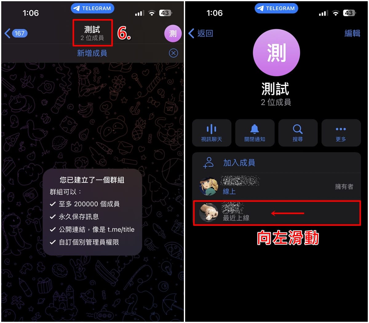 现在群组里还有你刚加的那位朋友,别急,点一下顶部的「群组名称」,在成员列表找到对方,对着名字「向左滑动」。
