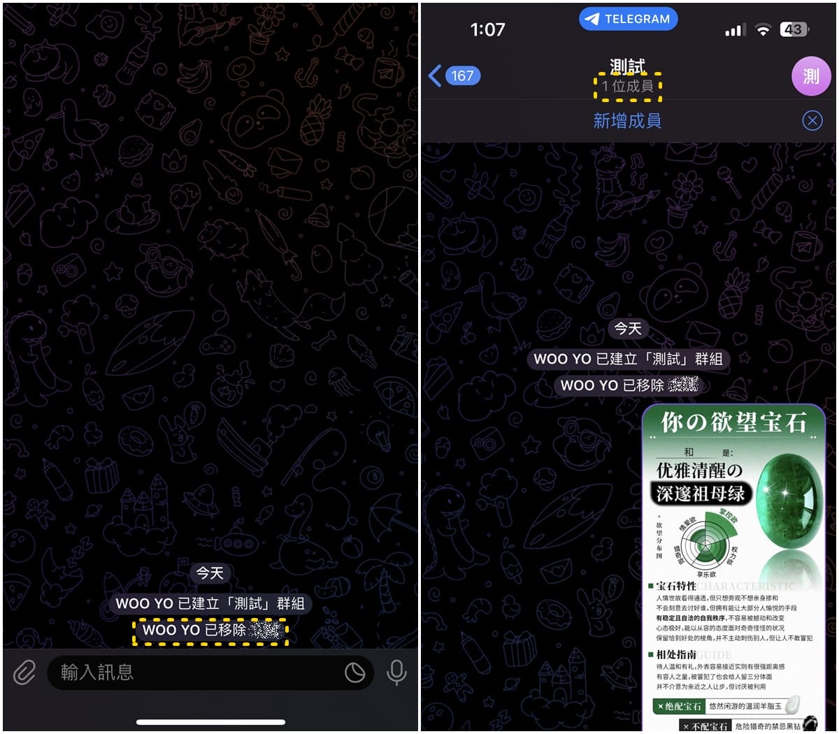 回到群组聊天室检查一下,下方会显示「移除成员」的消息,顶部显示「1位成员」,恭喜,你已经成功建立Telegeram一人群组,自己的专属暂存区诞生了!