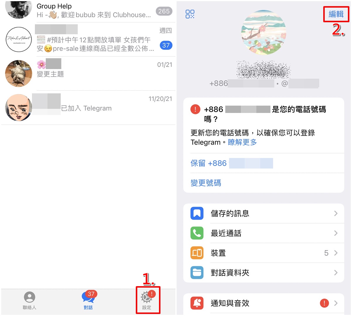 先打开手机版Telegeram,点右下角「设置」,再按进入个人页面的「编辑」。