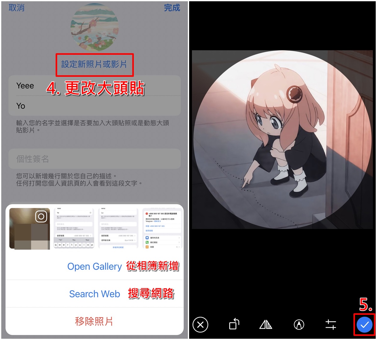 如果想换「大头像」,点最上方的「设置新照片或视频」,挑选、编辑你喜欢的图片,完成后按「蓝勾勾」就搞定啦。