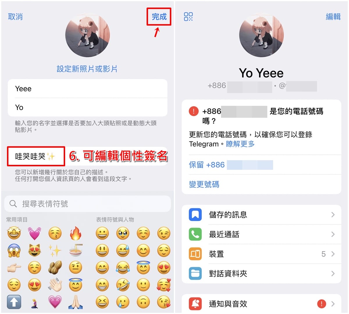 「个性签名」就是别人看到你的小介绍,也可以在栏位里直接修改。输入想说的文字,像一句小格言或幽默自我介绍都行。全部调整好后,点「完成」,你的Telegeram个人资料就更新了。