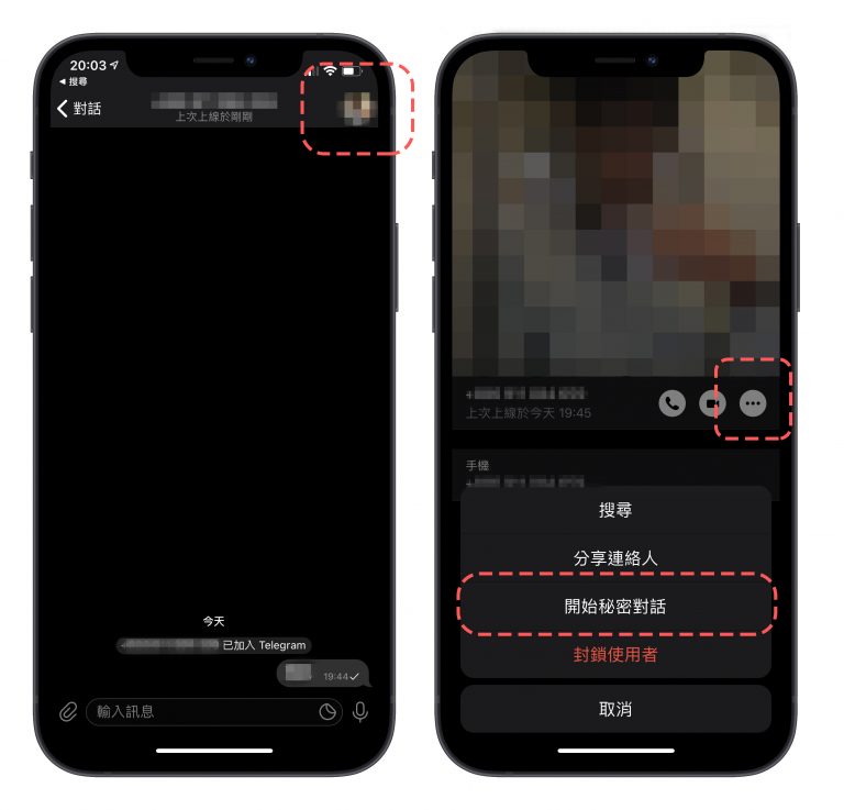 先打开你和朋友的对话框,然后点右上角朋友头像,这里会出现一个选项——「开始秘密对话」。