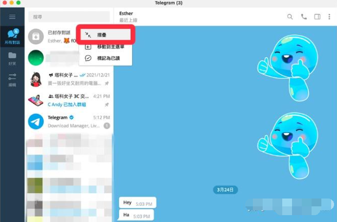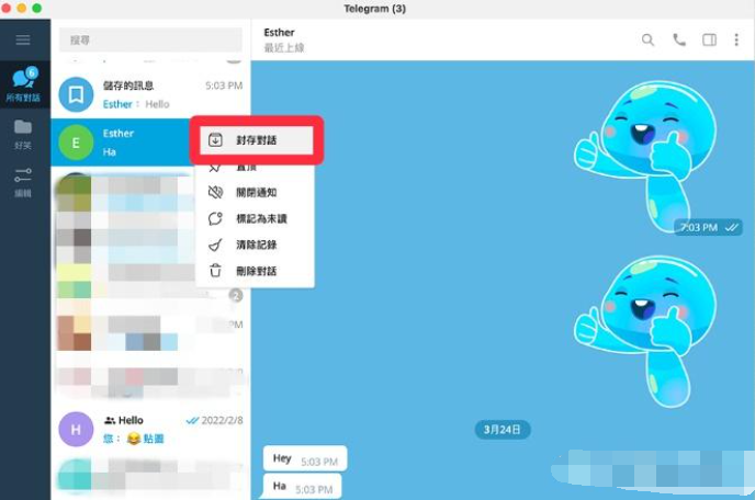 1、右键点击想隐藏的群组或频道 → 选择“封存对话”。
