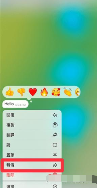 1、长按你想隐藏的消息 → 点击“转传”。