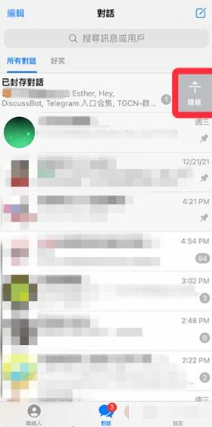 4、如果不想在聊天列表看到“已封存对话”,可以在该选项上再次左滑 → 选择“隐藏”。