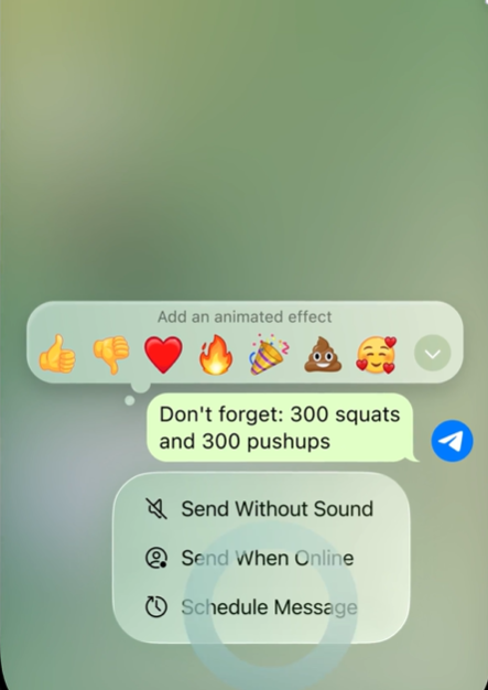 现在定时消息和提醒可以按日、每月两次等间隔重复发送,自动化日常事务或养成习惯更轻松。发送方法也很简单:长按任意聊天里的发送箭头,选择“重复”,设定你想要的时间间隔,就搞定了。