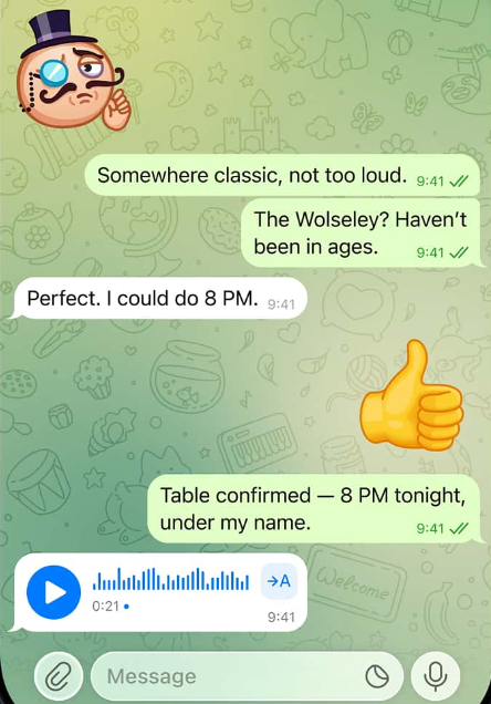 在今天的更新里,你可以直接在Telegeram Story里开启直播,还能和观众实时互动,真的是把体验拉满了。同时,重复发送的定时消息也上线了,帮你省心安排工作和提醒。更有新礼物的拍卖系统,让稀有礼物分发公平——以及更多好玩的更新。