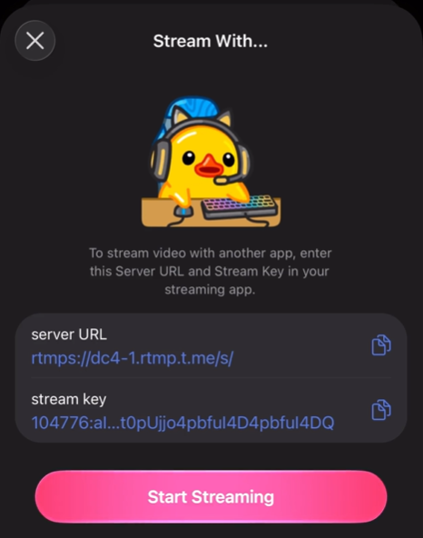 直播支持RTMP密钥,可对接OBS、XSplit等外部工具,创作者不用换设备就能直接在Telegeram上开播。想管理评论或设置每条评论收费?直播时点右上角选择“直播设置”。如果你希望某个用户管理聊天,可以给TA权限“管理视频聊天/直播”,就能帮你控制群或频道的直播。