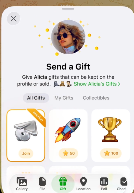 拍卖每轮结束,前几名都能拿到礼物,出价低的会自动进入下一轮。所有礼物发完后,多余的出价会退回。你可以多次参与增加获奖几率,随时加码也没问题。出价界面会显示本轮需要多少Stars才能赢得礼物。想浏览出售的礼物?去设置 > 发送礼物就能看到。拍卖礼物会有“拍卖”横幅,还会有专门的t.me/auction链接,下一次拍卖很快就来,别眨眼。
