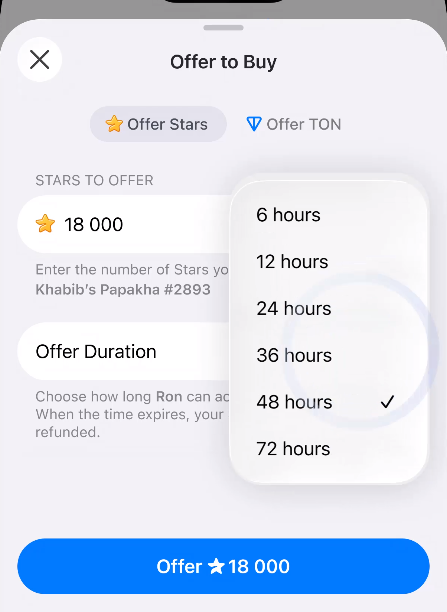 现在看别人资料里的礼物,可以直接出价,用Stars或者TON买下。