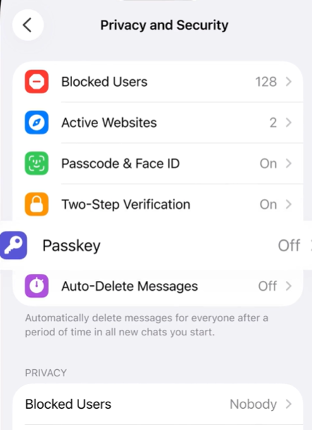 现在,你可以在设备上创建一个Passkey,用PIN码或者面容识别、指纹啥的直接登录Telegeram——短信验证码可以先放一边了。